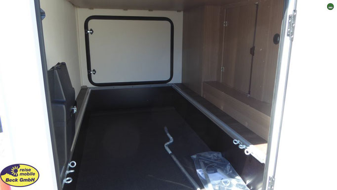 - 6 Schubfächer als fest installiertes Regal mit viel Zubehör und Werkzeug in der sehr geräumigen und beleuchteten Heckgarage